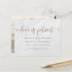 Yikes! Unvorhergesehene Umstände sind schwer zu planen, aber mit diesen Hochzeitskarten können Sie leicht gelassen Ihre Lieben wissen! Mit weißem Marmorboden. Die Wörter "Liebe ist geduldig" erscheinen oben in einer Imitat Rose Goldfolienkalligrafie mit süßen Wirbel. Im Rahmen der Budgetauswahl hier auf Zazzle kommen diese Einladungen nicht mit Umschlägen und passen nicht einfach in einen Standard-Umschlag. Die nahe Größe ist A6, aber es wird eine Lücke von ca. 10 cm geben. Wenn es Ihnen an Sicherheit fehlt, können Sie so weit verfügbare A6-Umschläge verwenden. Andernfalls kann dieses Design über das Design Transfer Tool in ein Standardformat (das mit Umschlägen geliefert wird) übertragen werden. Als grober Leitfaden würden zum Zeitpunkt des Schreibens 100 Einladungen zum Haushalt (einschließlich eines Mengenrabatts) etwa 39 Dollar kosten, während 100 Standardeinladungen einschließlich Umschläge etwa 135 Dollar kosten würden. Ihre Meilen können je nach den verfügbaren Promo-Codes von Zazzle, dem standortweiten Verkauf oder den Preisänderungen variieren.