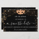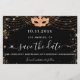 Eine gmädchenhafte und trendige Save the Date-Karte für ein 50. (oder jedes Alter) Geburtstag Maskerade Party. Ein klassischer schwarzer Hintergrund mit goldenem Glitzer-Staub in Imitaten und Maskerade. Personalisieren und fügen Sie Datum und Name/Alter hinzu. Der Text: Save the Date ist mit einem großen angesagten, handgeschriebenen Stilskript geschrieben.