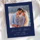 Diese schlichte, minimalistische Save the Date Karte verfügt über ein quadratisches Foto über den Worten "Save the Date" in elegantem, weißem Handschrift-Skript, gefolgt von den Namen der Ehepaare, Hochzeitstag und Stadt in sans Serif Schriftart auf marinebasischem Hintergrund. Fügen Sie eine detailliertere Nachricht mit weiteren Informationen auf der Rückseite hinzu.
