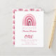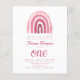 Eine moderne, schicke und mädchenhafte Einladung zum ersten Geburtstag in pink boho inspiriert Thema mit rosa Aquarellenbogen-Element und Serif-Script-Schriftart.