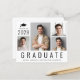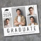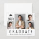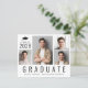 Eine preisgünstige minimale Ankündigung des modernen Abschlusses mit einer 4-Foto-Collage, "Graduate" in großen Buchstaben und seinem Klassenjahr, seinem Namen und seiner Schule oder Universität in einfacher Typografie.