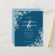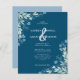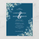 Moderne Hochzeitseinladung. Mit Schnörkeln aus rustikalem Grün und kleinen blauen Blumen auf einem ägäisch-blauen Hintergrund. Einfach mit Ihren einzigartigen Informationen anpassen.