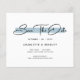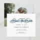 Budget Modernes Minimalistisches Skript Save the Date Einladungs-Karte bietet "Save the Date" in einem eleganten schwarzen Skript über einen modernen blauen Akzent auf einem weißen Hintergrund mit Ihren Save the Date Informationen unten. Anpassen, indem Sie den Text in den bereitgestellten Textfeldern bearbeiten und das Foto auf der Rückseite hinzufügen. Entwickelt für Sie von ©Evco Studio www.zazzle.com/store/evcostudio