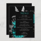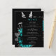 Dieses elegante, stimmungsvolle Hochzeitsmenü bietet ein üppiges, romantisches Blumenstrauß in aquamarinem Blau mit silberner Imitat-Folie und Glitzer-Blattwerk auf schwarzem Hintergrund. Passen Sie den silbergrauen Text in stilvollen Schriftart auf einem schwarzen Rechteck an. Die Rückseite der Karte ist schwarz.
