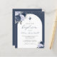 Diese elegante Taufinspektion mit weißem Bogen auf marineblau-blauem Hintergrund, flankiert von zwei Ecken mit dustigen blauen und marineblauen Blumenbouquets mit silberfarbenem Blattwerk. Ein dritter, kleinerer Bouquet erscheint auf einem silbernen Imitat-Folienkreuz, oberhalb der Worte "Bitte begleiten Sie uns für die Taufe unseres Sohnes" in eleganter marineblauer Handschrift Kalligraphie und Holzkohle-Graukursivschrift. Personalisieren Sie es mit dem Namen in blauem Skript und die Details in grauen Sans Serif Schriftart. Ein Sprinkling aus silbernen Imitate Folie Konfetti schmückt die obere Kante der Karte. Die Rückseite ist massiv marineblau.