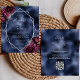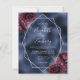 Diese elegante, moderne Hochzeitseinladung besticht durch einen silbernen geometrischen Rahmen, der mit bordeauxroten und silberfarbenen Blumenbouquets auf einem seeblauen Imitat-Hintergrund dekoriert ist. Der anpassbare Text kombiniert silbergraue, weißliche Handschrift, Kupferplatte und kursiven Schriftart. Die Rückseite bietet Platz für Hochzeitsdetails, zusammen mit einem QR-Code können Gäste scannen, um Ihre Website und UAWG.