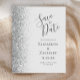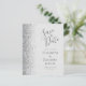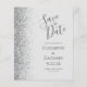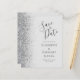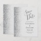 Die links Hand dieses eleganten, modernen Hochzeitsgeschehens bewahrt die Dattelkarte mit einem silbernen Imitat Glitzer Rand. Der individuell anpassbare Text kombiniert handgeschriebene Holzkohle und kopperplate-Schriftart auf einem hellgrauen Hintergrund. Auf der Rückseite ist ein passendes grau- und silberfarbenes Design erkennbar.