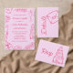 A whimsical and original hand-drawn wedding illustration featuring playful, sketch-style icons arranged in a charming repeating pattern. Romantic details such as tiered wedding cakes, champagne flutes, envelopes, rings, candles, and delicate floral accents are illustrated with soft, flowing red linework on a blush pink background. This design is fully customisable, allowing you to personalise all wedding details including names, date, time, venue, and wording to suit your celebration. With its lighthearted yet elegant aesthetic, this invitation is perfect for couples seeking a sweet, modern, and romantic look for their wedding stationery.
