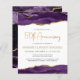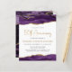 This elegant 50th anniversary party invitation features a top and bottom border of watercolor agate geode in shades of purple with faux gold glitter highlights. The words "50th Anniversary" appear in sparkly gold faux foil in decorative modern handwriting font. Customize it with the names of the guests of honor in gold-colored text and the party details in charcoal gray on a white background. A matching purple and gold agate image appears on the reverse side.