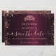 Eine gmädchenhafte und trendige Save the Date-Karte für eine Quinceañera, 15. Geburtstagsfeier. Ein bordeauxrotes Imitat mit metallisch anmutender Hintergrundfarbe. Dekoriert mit Rose vergoldeten Imitaten Glitzer Staub und ein Tiara, Krone. Der Text: Save the Date ist mit einem großen angesagten, handgeschriebenen Stilskript geschrieben.