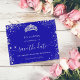 Eine gmädchenhafte und trendige Save the Date-Karte für eine Quinceañera, 15. Geburtstagsfeier. Ein königsblauer Hintergrund. Dekoriert mit Imitaten silbernen Glitzer Staub und ein Tiara, Krone. Der Text: Save the Date ist mit einem großen angesagten, handgeschriebenen Stilskript geschrieben.
