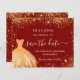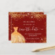 Eine gmädchenhafte und trendige Save the Date-Karte für eine Quinceañera, 15. Geburtstagsfeier. Stilvolles Rot mit goldfarbenen Imitaten, Glitzer Glitzern und Kleid. Personalisieren und fügen Sie Datum und Name/Alter hinzu. Der Text: Save the Date ist mit einem großen angesagten, handgeschriebenen Stilskript geschrieben.