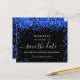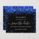 Ein schwarzer Hintergrund mit königsblauen Konfetti. Personalisieren und fügen Sie Datum und Name/Alter hinzu. Der Text: Save the Date ist mit einem großen angesagten, handgeschriebenen Stilskript geschrieben.