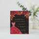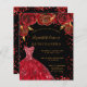 Eine moderne, stilvolle und glamouröse Einladung zu einer Quinceañera, 15. Geburtstagsfeier. Schwarzer Hintergrund mit Glitzern, rotes Kleid und rote Rosen, Blumenmuster. Der Name ist mit einem modernen handgeschriebenen Stilskript geschrieben. Personalisieren Sie Ihre Party-Daten und fügen Sie sie hinzu.