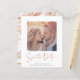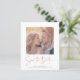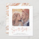 BUDGET Elegante Rose Gold Marmor Typografie Save the Date Foto Card in einem eleganten Schriftart, der ein romantisches handgeschriebenes Gefühl hervorruft. Auf der Rückseite ist eine modische koppery Rose goldgeflochtene Adern, die durch klassischen Marmor laufen. Fügen Sie Ihr Lieblings-Foto für zusätzliche Anpassungen hinzu. Fügen Sie einfach Ihre Namen und Daten für ein wirklich personalisiertes Design hinzu. **Unser BUDGET-Papier ist kleiner und zarter, aber trotzdem schön!** Wenn Sie Hilfe oder passende Artikel benötigen, kontaktieren Sie uns bitte unter cedarandstring@gmail.com.