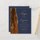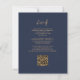 Die links Kulisse dieser eleganten, modernen Hochzeitseinladung besticht durch einen gelben, mit Imitaten vergoldeten Glitzer in Orange und Rost geschliffenen Wasserfarben. Der benutzerdefinierbare Text kombiniert das goldfarbene Handschriftzeichen mit serifenlosen Schriftart auf marineblarem Hintergrund. Die Rückseite bietet Platz für Hochzeitsdetails auf einem marineblauen Hintergrund, zusammen mit einem QR-Code, den die Gäste scannen können, um Ihre Website und UAWG zu besuchen, was die Kosten für den Druck und Versand separater RSVP-Karten rette.