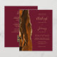Rett die Kosten für das Drucken und Verschicken separater RSVP-Karten mit dieser eleganten, modernen All-in-One-Hochzeitseinladung. Die links Kante besteht aus einem gelb-orangen und rostfarbenen Wasserfarbstreifen, der mit goldenen Imitaten Glitzer bestickt ist. Der anpassbare Text kombiniert goldfarbene Handschrift, Copperplate und kursiv Schriftart auf bordeauxrotem Hintergrund. Die Rückseite bietet Platz für Hochzeitsdetails auf einem soliden bordeauxroten Hintergrund, sowie einen QR-Code, den Gäste scannen können, um Ihre Website und Ihre UAWG.