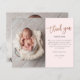 Dieses moderne Foto Dankeschön-Anmerkung verfügt über Rose Gold handgeschriebene Drehbuch danke, persönliche Nachricht und ein vertikales Foto auf der Vorderseite. Auf der Rückseite befindet sich ein zweites Baby-Foto, das ein volles, waagerechtes Foto ist.