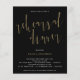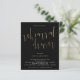 Elegantes Script Probe Dinner Gold Black Einladung. Eine preisgünstige SMALLER 4.5" x 5.6" Alternative. Erhältlich in einem SEMI GLOSS 110lb CARD STOCK oder einem SATIN FINISH 80lb THINNER PAPIERSTOCK. Umschläge sind optional. Probe Dinner ist in einem stilvollen Set Kalligraphie in Gold und die Erholung des Textes können Sie leicht personalisieren. Sie können auch Text und schwarze und goldene Hintergrundfarben auf beiden Seiten ändern, wenn Sie möchten, indem Sie die Option Weitere anpassen wählen.