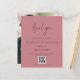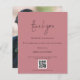Script QR Code Hochzeit Foto Galerie Dusty Rose Pink Dank. Ein Preis SMALLER 4,5" x 5,6" Alternative. Erhältlich in einem SEMI-GLOSS 110 lb CARD STOCK, der die Standardoption (dicker für Einladungen) ist, ODER einem SATIN FINISH 80 lb THINNER PAPER STOCK (ideal für Gehäuse). Umschläge sind optional und etwas größer als die Kartengröße. Ein minimalistisches Typografie-Design mit einem Set-Stilskript für Dankeschön. Auf der Rückseite ersetzen Sie das Beispielbild mit Ihrem eigenen Favoriten aus Ihrem Tag, um Ihre Gäste zu schützen. Personalisieren Sie die Erholung des Textes einfach mit Ihrer Nachricht und Ihren Namen und ersetzen Sie das QR-Codebeispiel durch Ihre eigene, die zu Ihrer Online-Hochzeit-Foto-Galerie führt.