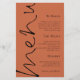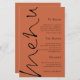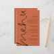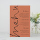 Dieses zeitgenössische Terrakotta-Design hat Menu in elegantem Set-Skript, das auf der links Seite läuft und die Erholung des Textes auf der rechten Seite ausgerichtet ist, die Sie leicht personalisieren können, sowie Ihre Namen und das Hochzeitstag auf der Rückseite. Text- und Hintergrundfarben auf beiden Seiten können über die Option Weitere anpassen auf jede beliebige Seite geändert werden.
