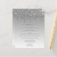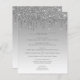 Dieses elegante Hochzeitsmenü besticht durch einen silbernen Tropfen-Glitzer und einen silberfarbenen Hintergrund. Der benutzerdefinierbare Text kombiniert graues Handschriftzeichen und serifenlose Schriftart.