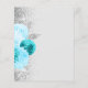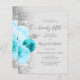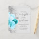 The left-hand edge of this elegant modern 50th anniversary party invitation features a turquoise and teal watercolor floral bouquet trimmed with silver foliage and faux silver glitter. The customizable text combines charcoal gray handwriting, copperplate and italic fonts on a pale gray background. The reverse side features a matching design.