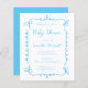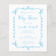 Die Babydusche dieses trendigen Jungen ist mit einem skizzenhaften, kritzeln Rahmen von himmlisch blauen, von Hand gezeichnet Curlicues und Bogen auf weißem Hintergrund ausgestattet. Personalisieren Sie den handgeschriebenen blauen Text mit dem Namen der Mutter-zu-sein und allen wichtigen Details. Die Rückseite der Karte ist blau und massiv.