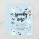 Ein niedliches Baby blauer Geist Halloween 1. Geburtstagsfeier Party Einladung. Modernes Halloween-Design für ein unheimliches Party! Diese Geburtstagsveranstaltung beinhaltet Spinnennetze, Gespenster, Kürbis, Fledermäuse, Spinnen, Blätter, Mais, Sterne und Gänseblümchen. Diese Einladung ist großartig für kleine Jungen!