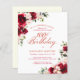 Red roses and blush pink peonies are nestled in dark green leaves on this beautiful and unique birthday invitation.
