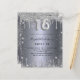 Eine moderne, stilvolle und glamouröse Einladung für eine Girl's Sweet 16, 16. Geburtstagsparty. Ein silbernes Imitat mit Glitzer-Staub. Personalisieren Sie Ihren Namen und Ihre Party-Daten und fügen Sie diese hinzu. Nummer 16 wird mit einem Schriftart im Ballonstil geschrieben, Skript.