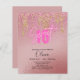 Hübscher Glamour Mädchen ist das Wesen dieser Imitate rosa und goldene Glitzer Folie süß 16, sechzehnte Mädchen Geburtstagsfeier Einladung. Textvorlagenfelder beiderseits ermöglichen es Ihnen, UAwg, Gift-Registrierung und alle weiteren lieblichen16-Party-Ereignisdetails bei Bedarf einzubinden.