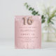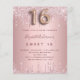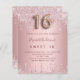 Eine moderne, stilvolle und glamouröse Einladung für eine Girl's Sweet 16, 16. Geburtstagsparty. Eine staubige Rose, rosa Imitate metallisch aussehend mit einem eleganten Imitat Glitzer Tropfen, Farbe Tropfen aussehen. Der Name ist mit einer modernen dunklen Rose goldfarbenen Handschrift geschrieben, die als Stilschrift dient. Personalisieren Sie Ihre Party-Daten und fügen Sie sie hinzu. Nummer 16 wird mit einem Schriftart im Ballonstil geschrieben, Skript.