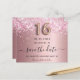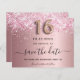 Eine gmädchenhafte und trendige Save the Date-Karte für eine Sweet 16, 16. Geburtstagsfeier. Rosa Imitat mit rosa Imitat metallisch mit rosa Glitzer Staub. Personalisieren und fügen Sie Datum und Namen/Text hinzu. Der Text: Save the Date wird mit einem großen angesagten, handgeschriebenen Stilskript mit Swashes geschrieben. Nummer 16 mit einer Rose goldfarbenen Ballon Stil Schriftart.