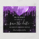 Eine gmädchenhafte und trendige Save the Date-Karte für eine Sweet 16, 16. Geburtstagsfeier. Schwarzer Hintergrund mit lila Imitaten Glitzer Tropfen, Glitzern und Ballons. Personalisieren und fügen Sie Datum und Name/Alter hinzu. Der Text: Save the Date ist mit einem großen angesagten, handgeschriebenen Stilskript geschrieben.
