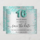 Eine gmädchenhafte und trendige Save the Date-Karte für eine Sweet 16, 16. Geburtstagsfeier. Ein Imitat silber aussehender Hintergrund mit aquamarinen, grünen Imitaten Glitzer Staub. Personalisieren und fügen Sie Datum und Name/Alter hinzu. Der Text: Save the Date ist mit einem großen angesagten, handgeschriebenen Stilskript geschrieben. Nummer 16 mit einem Schriftart im Ballonstil.