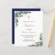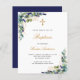 Weiß, mit Eukalyptusgrün, goldenen Blätter und einem goldenen Kreuz dekoriert. Personalisieren und die Kinder Name und Zeremonie Details. Schwarze und goldfarbene Buchstaben. Zurück: marineblaue Hintergrundfarbe.