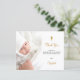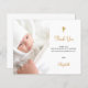 Eine weiße und Imitate Gold minimalistische Taufe danke Ihnen Karte. Personalisieren Sie und fügen Sie Ihr Foto des Kindes, danke Ihnen Notiz und Name. Geschlechterneutral. Zurück: Social Media-Icons, Ihr eigener qr-Code zu Ihrem Instagram-Konto oder Ihrer Website, damit Ihre Gäste mehr Fotos sehen können. Diese Karte ist auch in unserem Shop ohne Social Media Icons erhältlich.