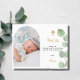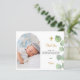 Eine moderne und elegante Taufe danke Ihnen Karte. Ein eleganter weißer Hintergrund mit Eukalyptusgrün. Personalisieren Sie und fügen Sie Ihr Foto des Kindes, danke Ihnen Notiz und Name. Rahmen für Foto. Zurück: hellblaue Hintergrundfarbe.