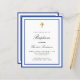 Eine moderne, elegante und taufende Einladung. Weiße, mit königsblauen Rahmen dekorierte Untergrundflächen. Personalisieren und fügen Sie einen Namen und Details. Schwarze Buchstaben.