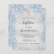 Eine moderne, elegante Taufe, die einen kleinen Jungen feiert. Imitate silbermetallischer Hintergrund mit blauen Imitaten Glitzer Staub und ein goldenes Kreuz. Personalisieren und fügen Sie einen Namen und Party-Details hinzu. Schwarze Buchstaben.