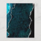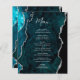 This elegant modern wedding menu features a teal blue watercolor agate background trimmed with faux silver glitter. The customizable text combines silver gray handwriting script and copperplate fonts. The reverse side features a matching teal and silver agate design.
