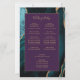 This elegant, modern wedding program features a teal agate background trimmed with gold faux glitter. The text appears in elegant gold-colored handwriting and copperplate fonts on a purple rectangle.