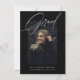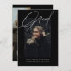 Einfache Trendy Calligraphy Foto Abschluss Einladung mit einem Foto auf der Vorderseite und zwei Fotos auf der Rückseite zusammen mit Abschluss Einladungsdetails.