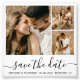 Budget Elegant Modern Trendy Kalligraphie Script 3 Foto Collage Save the Date Foto Paper in schwarz und weiß. Dieses minimalistische delikate romantische Design perfekt für moderne Hochzeiten. 3 (drei) Grid Foto Collage, eine whimsical Kalligraphie in handgeschriebenen Stil Swash Schwanz Schriftart. Einfach zu personalisieren mit Ihren Hochzeitsdetails und Bild. Niedriges Budget billig bezahlbares Foto Papier.
