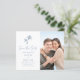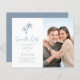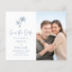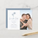 Diese elegante, staubige, blaue BudGET Save the Date-Karte mit zwei Palmen oberhalb des Textes, einem stilvollen Handschrift-Skript für die "Save the Date" Ankündigung und einem Foto des glücklichen Paares.