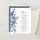 Die links Seite dieses romantischen Hochzeitsmenüs besticht durch einen Blumenstrauß in Aquarelltönen mit dustigen Blumen und Pflanzen. Der anpassbare Text kombiniert Handschrift, Copperplate und kursiv Schriftart in Holzkohle grau und staubblau auf weißem Hintergrund. Die Rückseite ist ein koordinierend solides staubiges Blau.