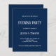Budget White Text Navy Blue Abend Party Einladung. Vollständig anpassbar. Ein modernes typografisches Design auf einer kleineren 4,5 x 5,6" Preis semi-Glanzkarte (ähnlich der Dicke einer Postkarte), um Ihre Abend zu Ihrer Hochzeit einladen. Farben können bei Bedarf durch weitere Anpassung geändert werden.
