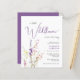 Eine elegante, preisgünstige Babydusche, die "eine kleine Wildblume ist auf dem Weg" in einer Mischung aus moderner, weicher grauer Typografie und einem stilvollen lila Drehbuch sowie einem boho-inspiriert Aquarellbouquet aus lila, rosa und gelben Wildblumen bietet.
