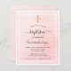 Eine moderne, elegante Taufe, die ein kleines Mädchen feiert. Rosa und weiße Rahmen, die mit kleinen goldenen Glitzern, Punkten und einem goldenen Kreuz geschmückt sind. Personalisieren und fügen Sie einen Namen und Party-Details hinzu. Schwarze Buchstaben.